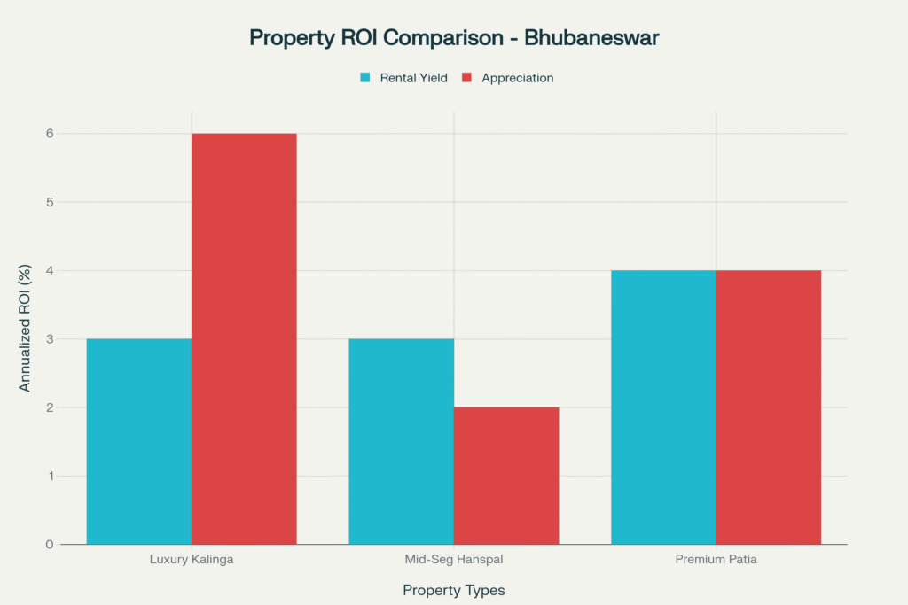 • Property Type: Villas/duplexes in Bhubaneswar mostly rely on appreciation, while 2/3BHK flats earn stronger rentals.