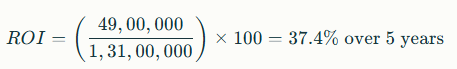 • ROI = (₹2,42,000 ÷ ₹87,00,000) × 100 = 2.78% rental yield per year